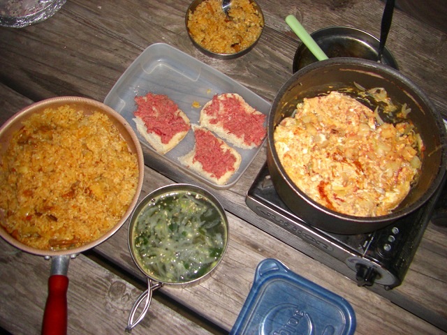 そして暗くなる前に夕食の準備です。今夜はカレーピラフにジャーマンオムレツにコンビーフパンにスープです。