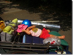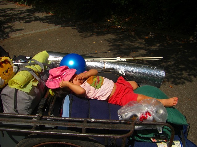 チェックアウトは11時なので、寝袋を干したり、テントを干したりしながらゆっくり片付けです。娘が帰りたくないのか、早起きで眠いのかぐずりまくりでしたが・・・リヤカーに乗せるとやっぱちぴたりと泣き止みました。眩しい様だったので帽子をかぶせてあげたらこの態度!!